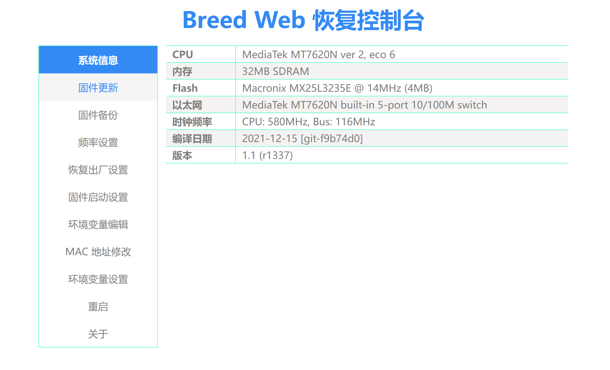 Breed 是由网友开发的一个号称“不死”的引导加载程序。只要路由器成功刷入 Breed 之后,随意更换路由器系统就不容易刷坏了,同时也具备了备份路由器系统和更改MAC的功能