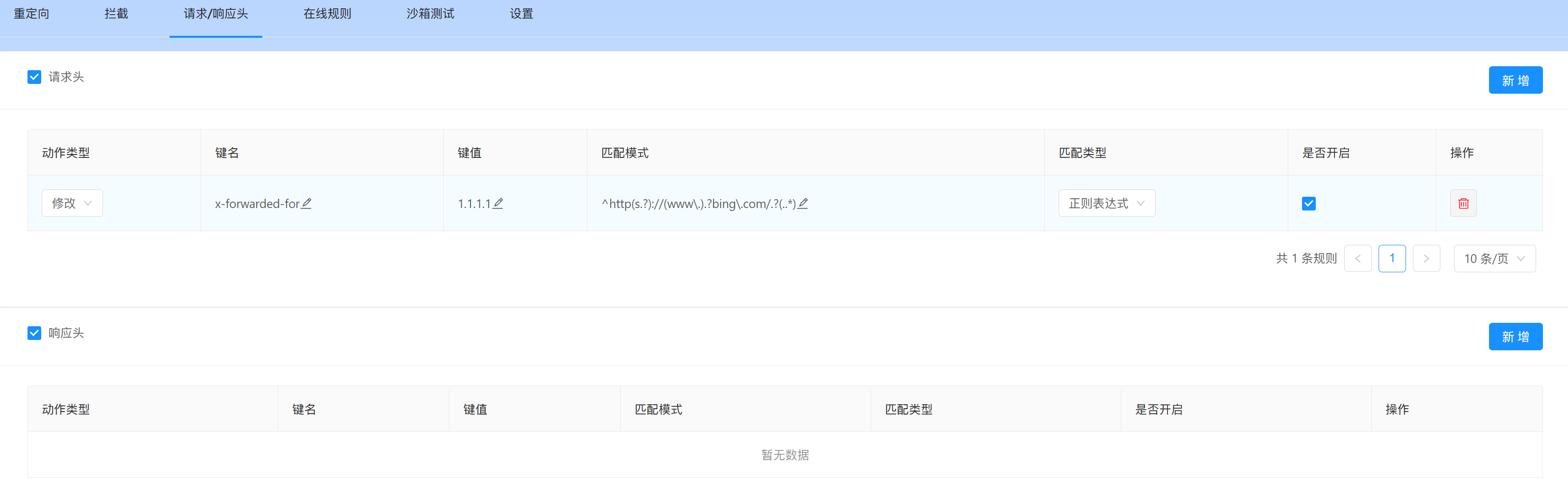 请求头:打勾启用 点击右侧按钮新增一条规则: